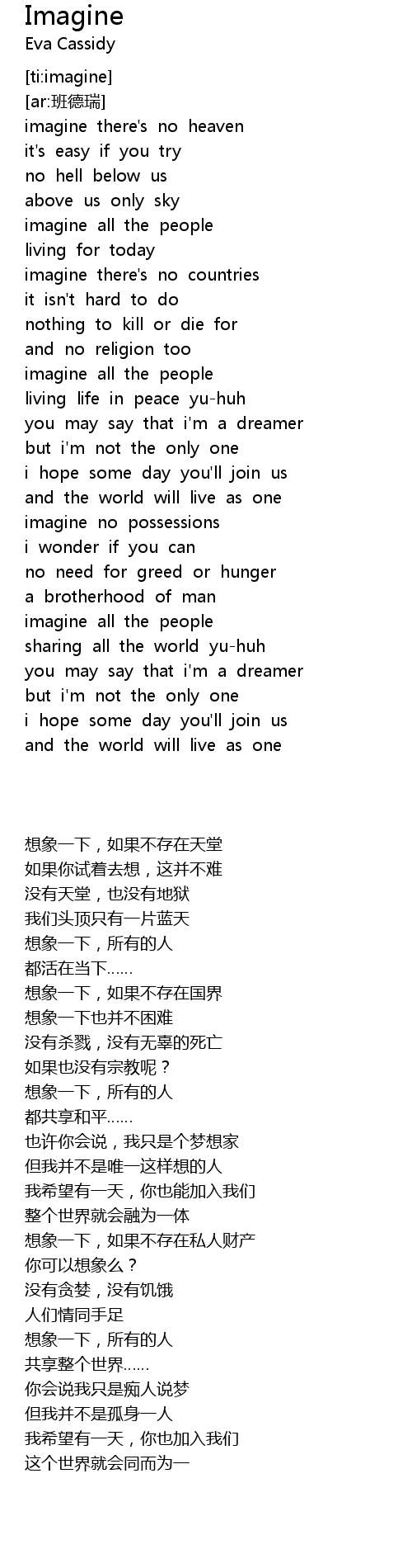 | [00:19.703] | 想象一下,如果不存在天堂 |
