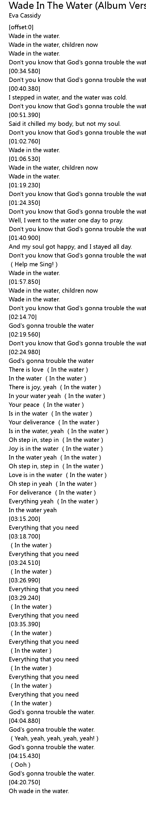 | [00:35.250] | Don't you know that God's gonna trouble the water? |