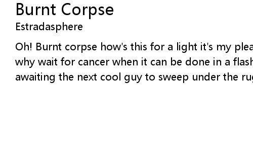 | Oh! Burnt corpse how's this for a light it's my pleasure to burn you 'well done' why wait for cancer when it can be done in a flash. fire throwin' gas is flowin' awaiting the next cool guy to sweep under the rug. |