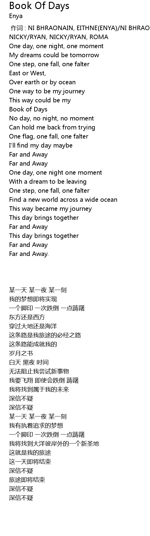 | [00:00.00] | 作词 : NI BHRAONAIN, EITHNE(ENYA)/NI BHRAONAIN, EITHNE(ENYA)/RYAN, NICKY/RYAN, NICKY/RYAN, ROMA |
