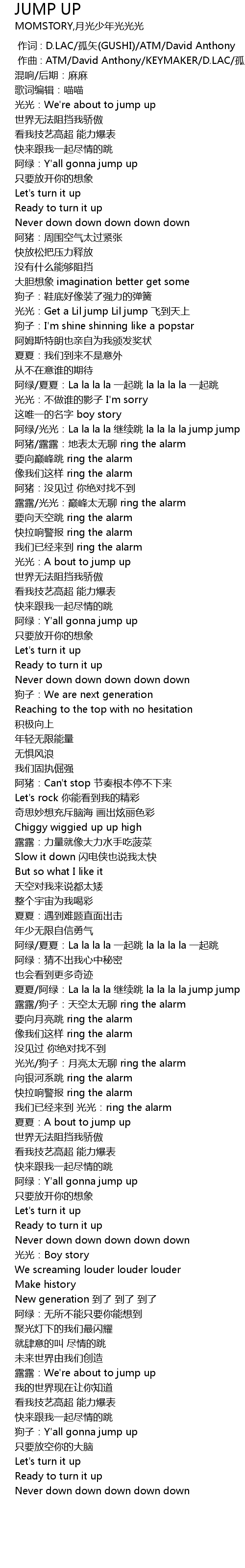 | [00:47.014] | guāng guāng: Get a Lil jump Lil jump fēi dào tiān shàng |