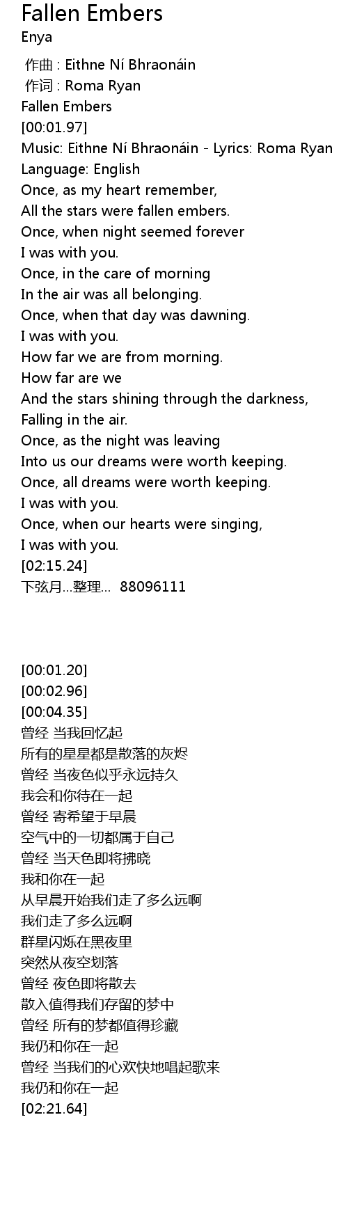 | [00:01.20] | Fallen Embers |