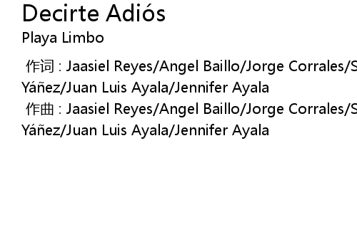 | [00:00.000] | 作词 : Jaasiel Reyes/Angel Baillo/Jorge Corrales/Servando Yáñez/Juan Luis Ayala/Jennifer Ayala |