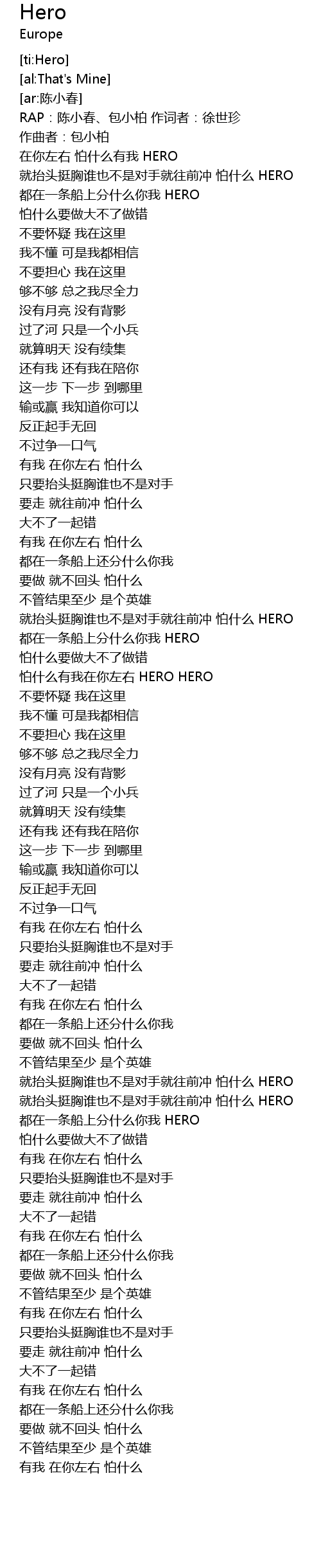 | [00:20.830] | 就抬头挺胸谁也不是对手就往前冲 怕什么 HERO |
