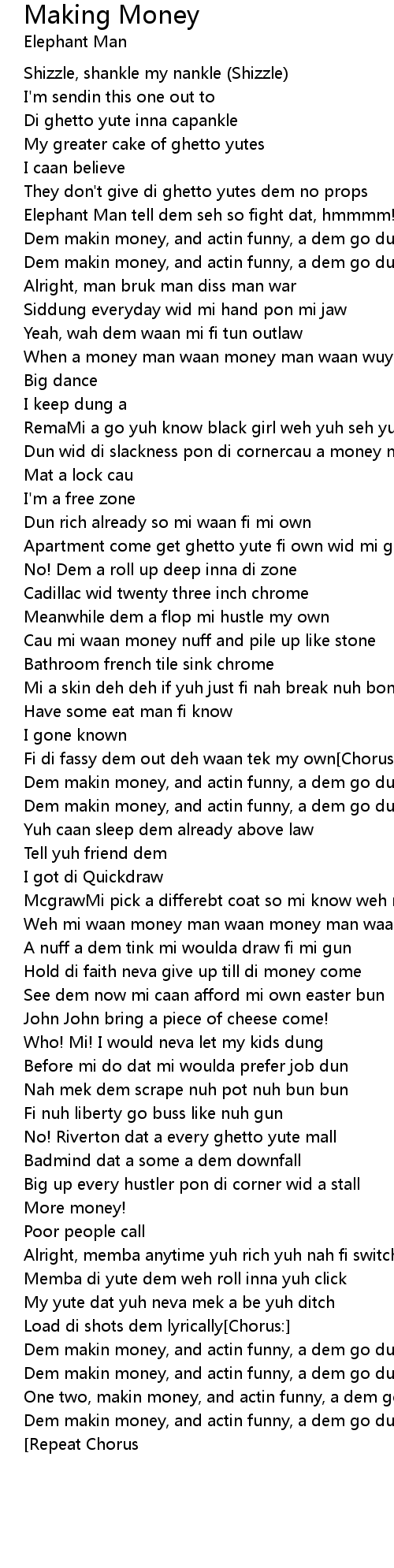 Dem makin money, and actin funny, a dem go dunny, and come a ball[Repeat Verse 1 ][Repeat Chorus][Repeat Verse 2 till end] |