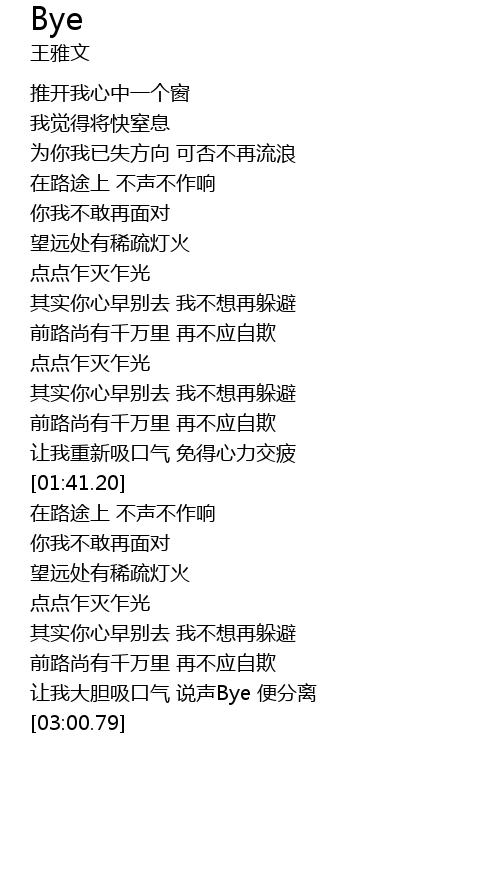 | [02:48.55] | ràng wǒ dà dǎn xī kǒu qì shuō shēng Bye biàn fēn lí |