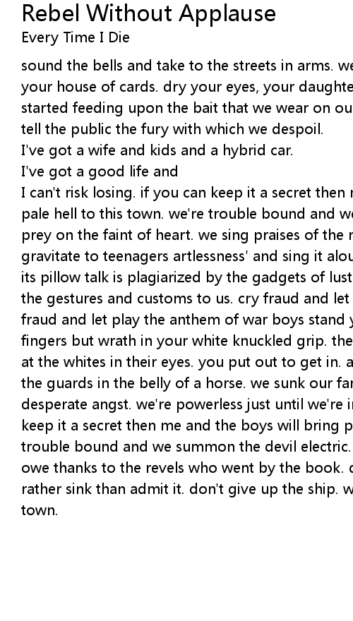 I can't risk losing. if you can keep it a secret then me and the boys will bring pale hell to this town. we're trouble bound and we summon the devil electric. prey on the faint of heart. we sing praises of the rebels who went by the book. gravitate to teenagers artlessness' and sing it aloud. the content is trivial. its pillow talk is plagiarized by the gadgets of lust. just go to sleep, leave the gestures and customs to us. cry fraud and let play the anthem of ear. cry fraud and let play the anthem of war boys stand your ground. keep the delicate fingers but wrath in your white knuckled grip. the film is loaded and it's aimed at the whites in their eyes. you put out to get in. and we slipped right past the guards in the belly of a horse. we sunk our fangs into the pulp of a desperate angst. we're powerless just until we're invited inside. if you can keep it a secret then me and the boys will bring pale hell to this town. we're trouble bound and we summon the devil electric. prey on the faint of heart. we owe thanks to the revels who went by the book. don't give up the ship. we'd rather sink than admit it. don't give up the ship. we only have one night in town. |