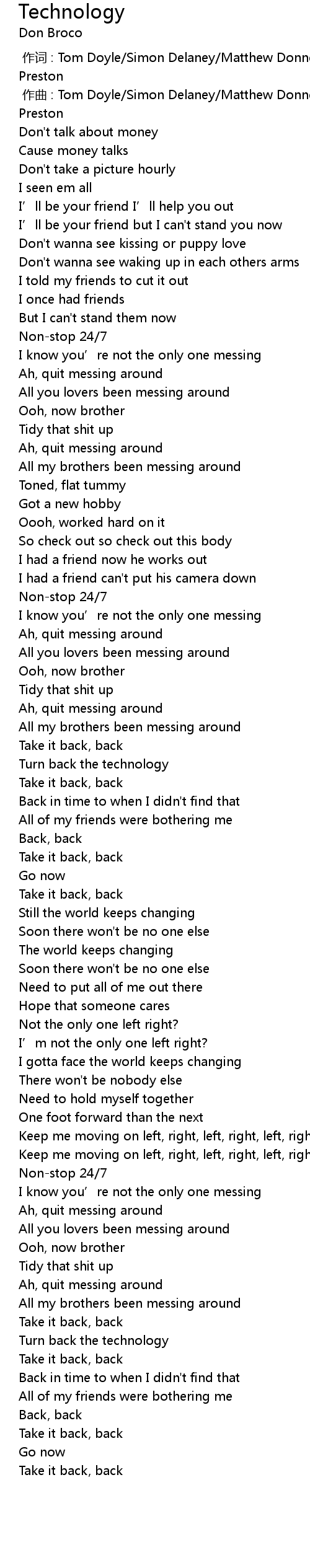 | [00:01.000] | 作曲 : Tom Doyle/Simon Delaney/Matthew Donnelly/Robert Damiani/Sam Preston |