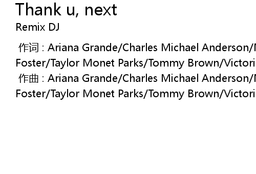 | [00:00.000] | 作词 : Ariana Grande/Charles Michael Anderson/Michael Foster/Taylor Monet Parks/Tommy Brown/Victoria Monet McCants/Kimberly Krysiuk |