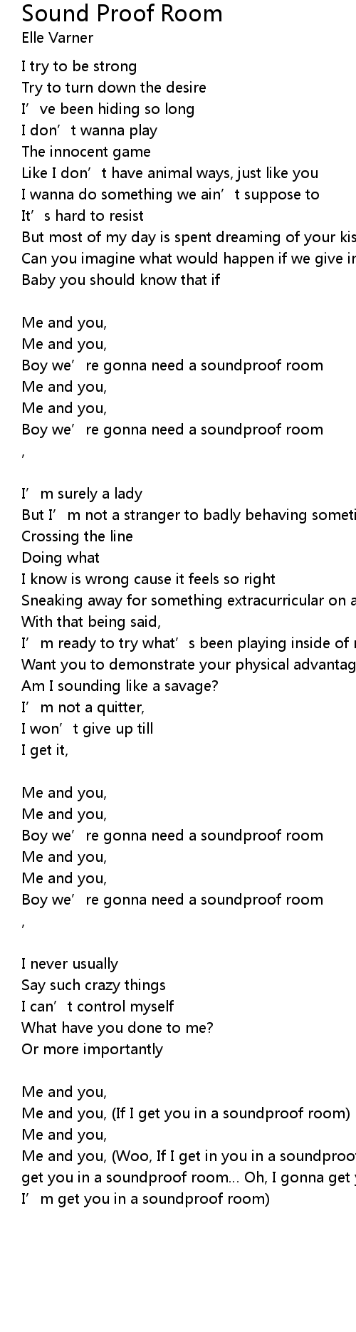 | Me and you, Woo, If I get in you in a soundproof room Hey, Yeah, Oh I wanna get you in a soundproof room Oh, I gonna get you in a soundproof Whoa, I' m get you in a soundproof room |