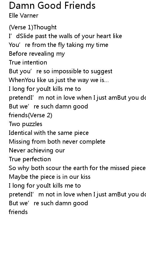 | [2x] | Please pardon me for my interjection Chorus I long for youIt kills me to pretendI' m not in love when I just amBut you don' t understandThat we' re suchDamn good friendsWe could be a whole lot more But we' re such damn good friends Verse 2 |