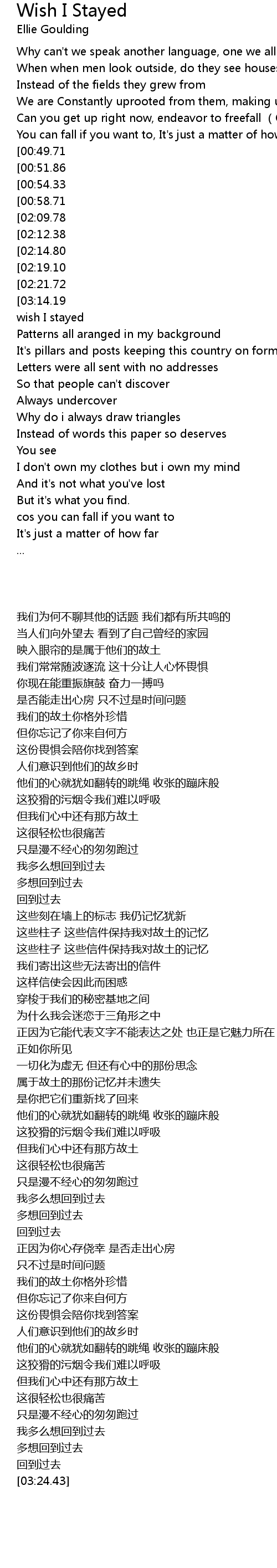 | [03:18.85][03:14.19][03:10.90][02:32.39][02:26.69][02:23.81][01:26.06][01:21.76][01:18.17] | I wish I stayed |