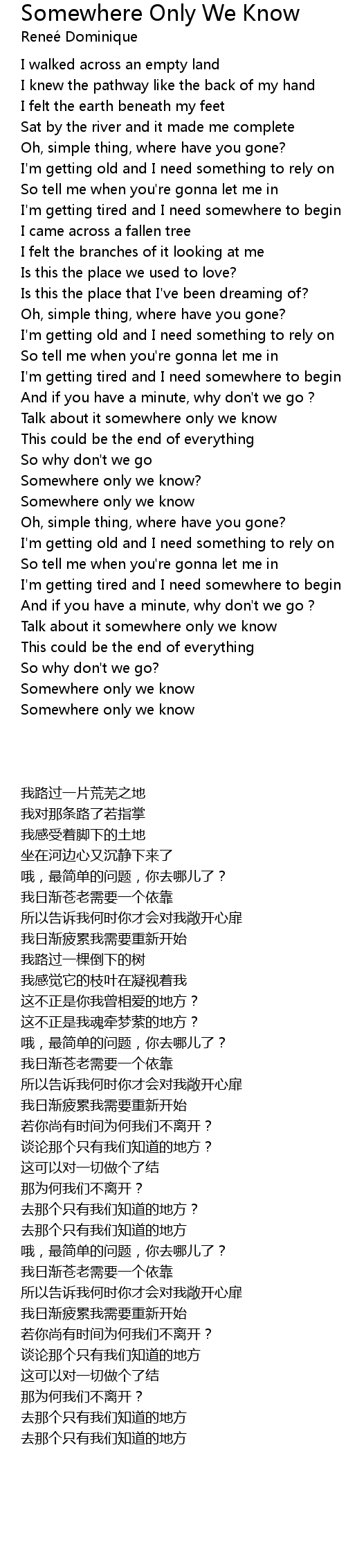 | [03:33.512] | Somewhere only we know |