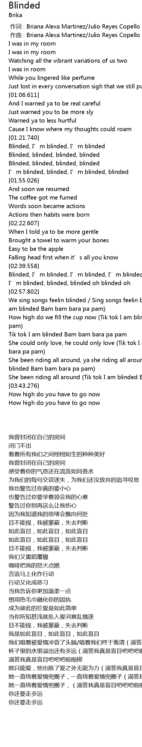 | [01:47.112] | I' m blinded, blinded, I' m blinded, blinded |