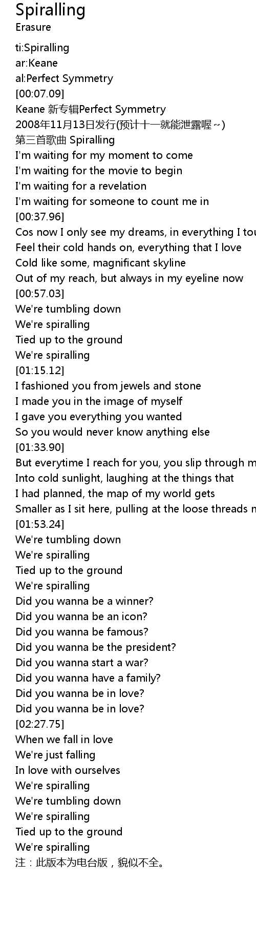 | [00:00.00] | ti:Spiralling |