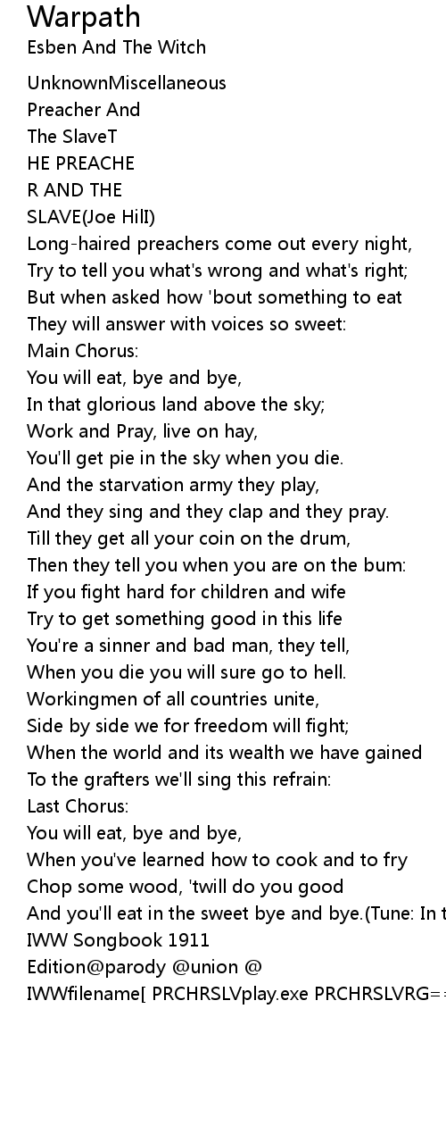 And you'll eat in the sweet bye and bye.(Tune: In the Sweet Bye and Bye)