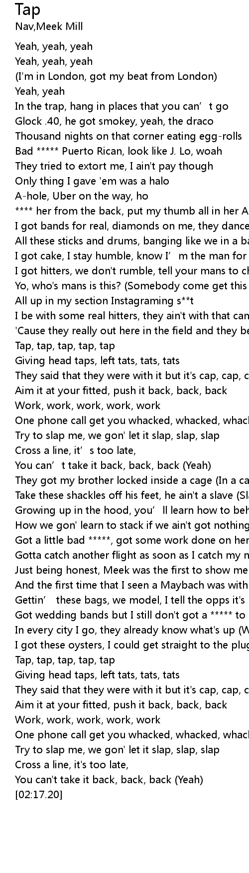 | [01:57.09] | Giving head taps, left tats, tats, tats |