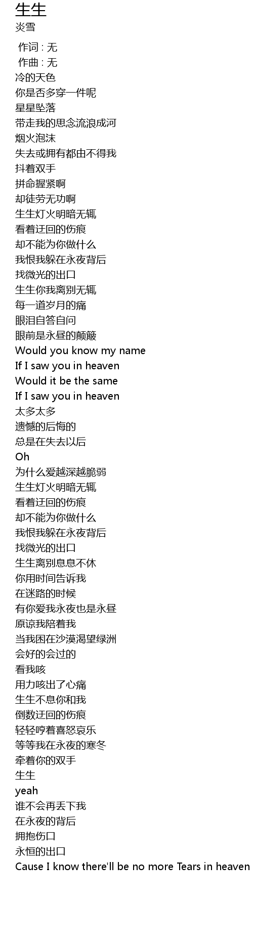| [04:25.955] | Cause I know there'll be no more Tears in heaven |