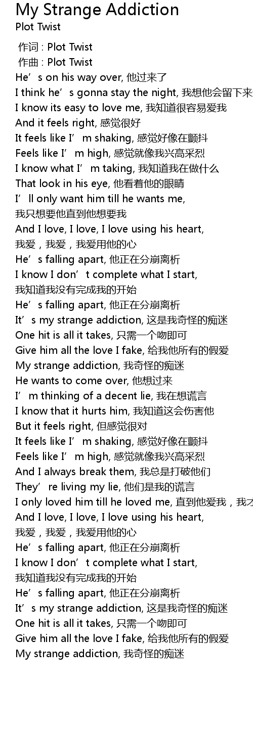 | [01:48.853] | It' s my strange addiction, zhe shi wo qi guai de chi mi |