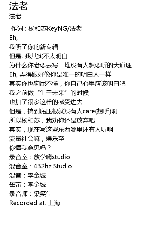 | [00:00.000] | 作词 : 杨和苏KeyNG/法老 |