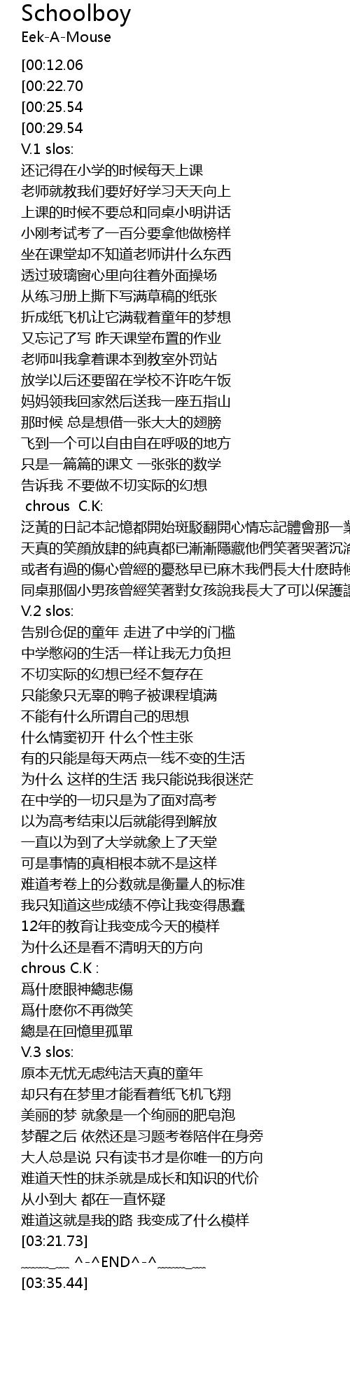 | [03:09.65][00:12.06] | chrous C.K: |