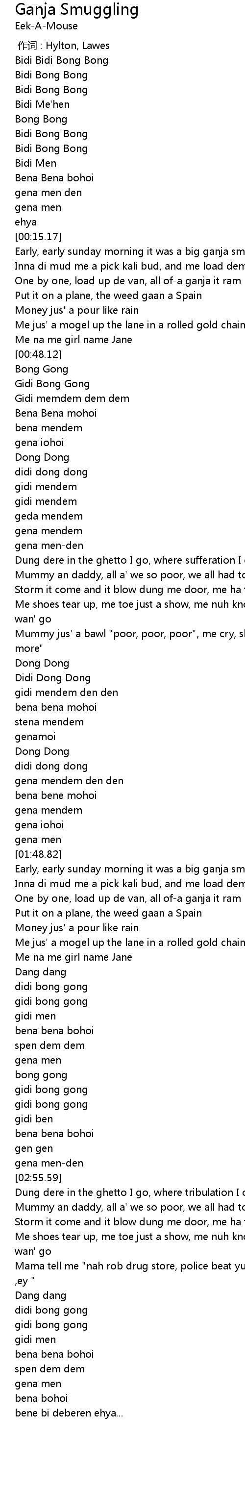 | [00:15.44] | Early, early sunday morning it was a big ganja smuggling |