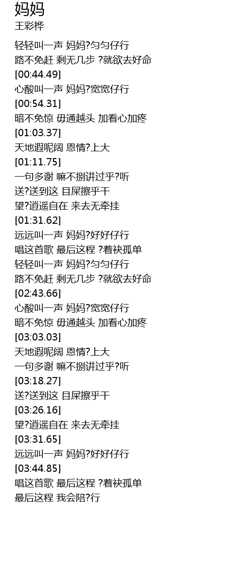 | [00:29.68] | 轻轻叫一声 妈妈?匀匀仔行 |