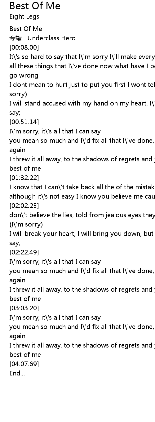 | [01:12.58] | I threw it all away, to the shadows of regrets and you would have the best of me |