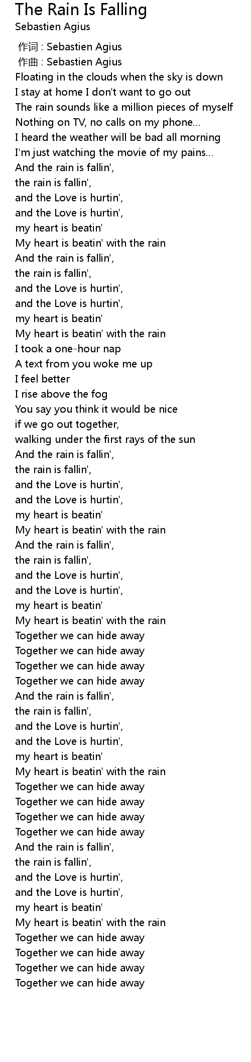 | [00:35.920] | And the rain is fallin', |