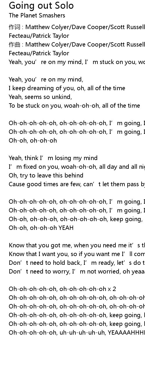 | Oh-oh-oh-oh-oh, oh-oh-oh-oh-oh, I’m going, I’m going, I’m going out solo | |
