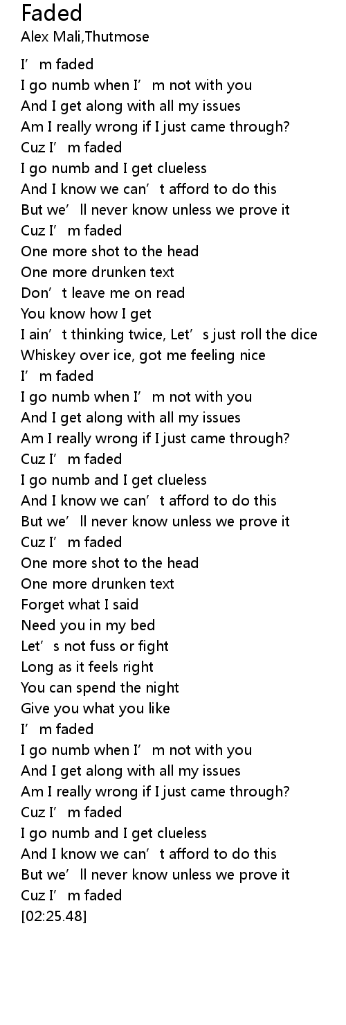 | [01:05.56] | Whiskey over ice, got me feeling nice |