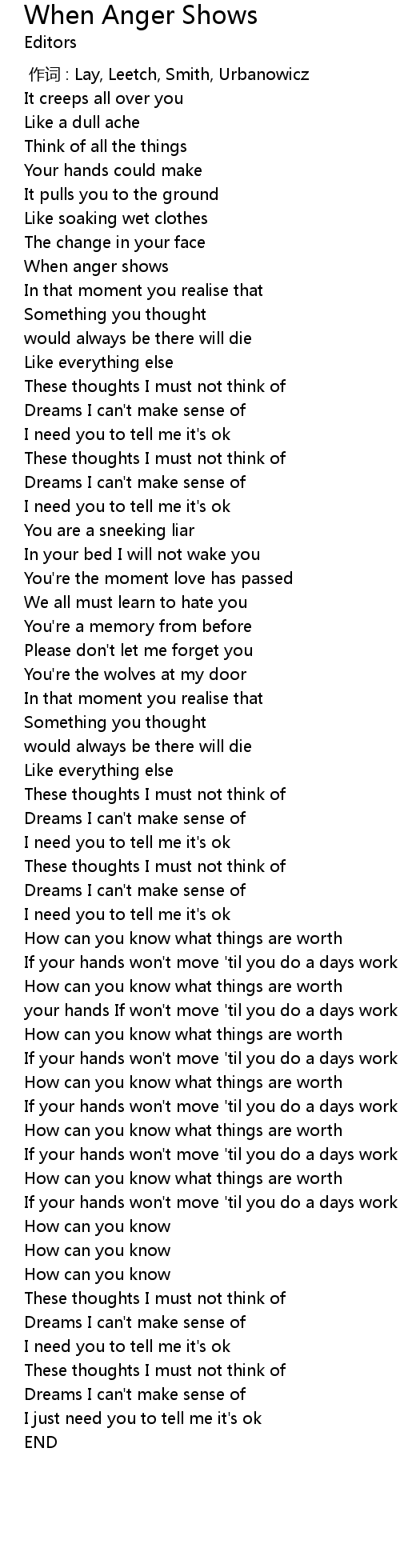 | [00:54.36] | When anger shows |