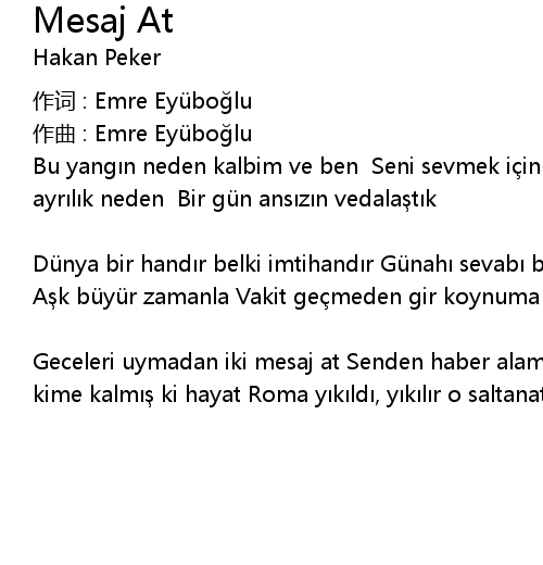 | Geceleri uymadan iki mesaj at Senden haber alamadan yatamam rahat Tarihe bir bak kime kalm ki hayat Roma y k ld, y k l r o saltanat |