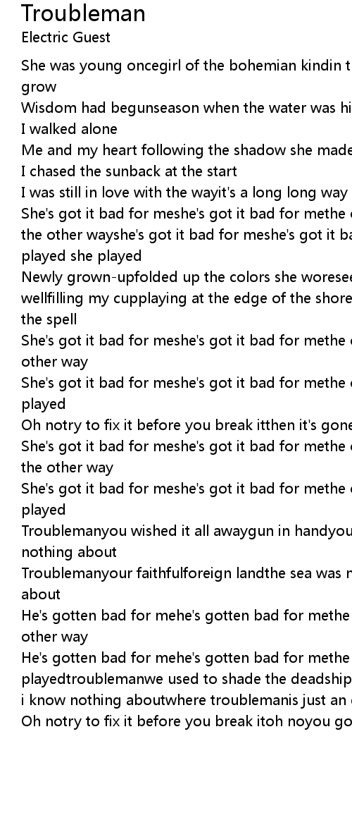 He's gotten bad for mehe's gotten bad for methe only game he played he playedtroublemanwe used to shade the deadship unmannedthe rain was just aheadand i know nothing aboutwhere troublemanis just an empty name |