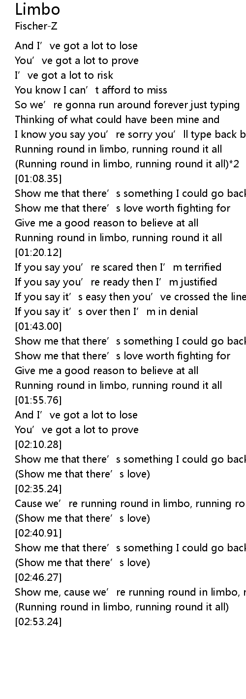 | [02:46.67] | Show me, cause we' re running round in limbo, running round it all |