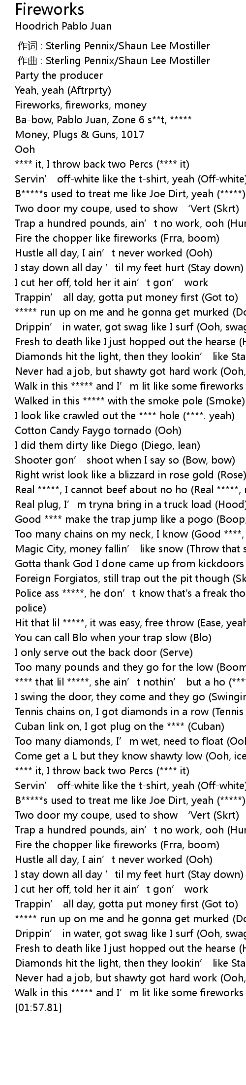 | [01:54.49] | Walk in this ***** and I’m lit like some fireworks (I'm lit) |