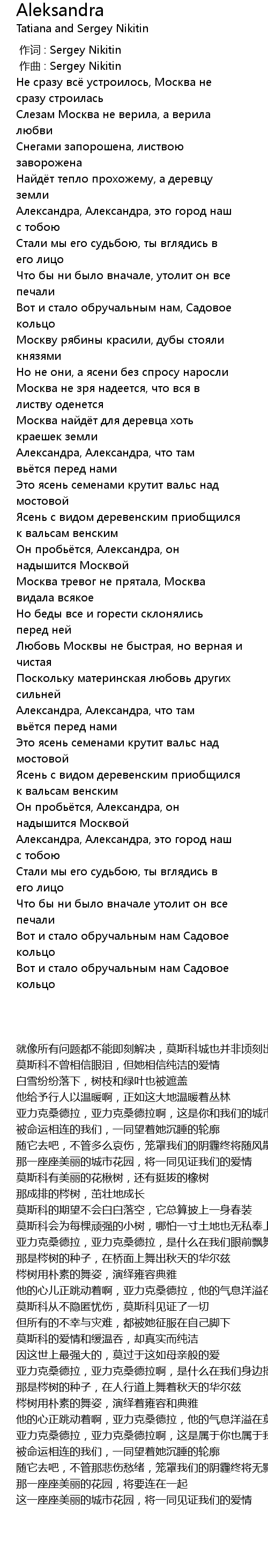 | [02:54.070] | 他的心正跳动着啊,亚力克桑德拉,他的气息洋溢在莫斯科城 |
