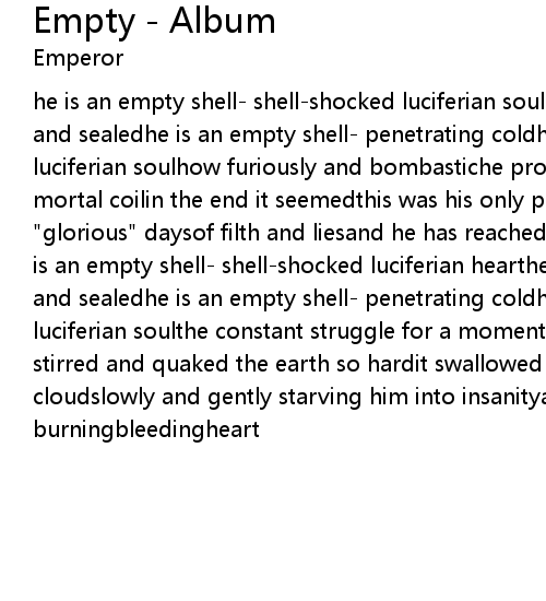 he is an empty shell- shell-shocked luciferian soulhe is an empty shell- drained and sealedhe is an empty shell- penetrating coldhe is an empty shell- empty luciferian soulhow furiously and bombastiche proclaimed his destructionof a mortal coilin the end it seemedthis was his only possessionlong past were his "glorious" daysof filth and liesand he has reached out to stop timeat its endhe is an empty shell- shell-shocked luciferian hearthe is an empty shell- drained and sealedhe is an empty shell- penetrating coldhe is an empty shell- empty luciferian soulthe constant struggle for a moment of quiet indulgenceeventually stirred and quaked the earth so hardit swallowed him in a dark and heavy cloudslowly and gently starving him into insanityan inferno of icewith an ever burningbleedingheart |