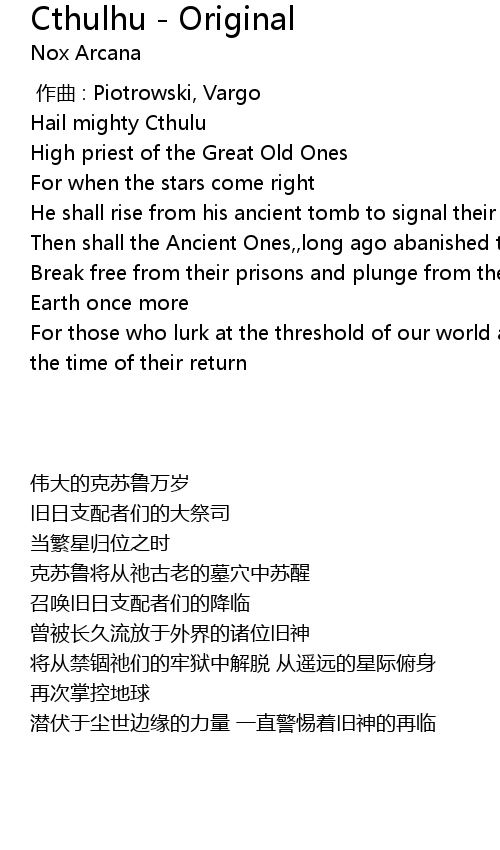 | [00:19.00] | 克苏鲁将从祂古老的墓穴中苏醒 召唤旧日支配者们的降临 |