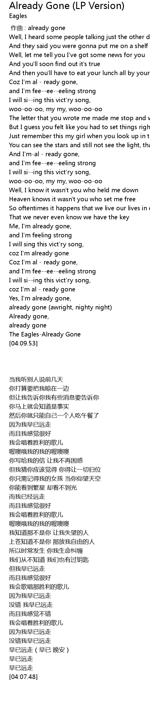 | [04:07.48] | The EaglesAlready Gone |