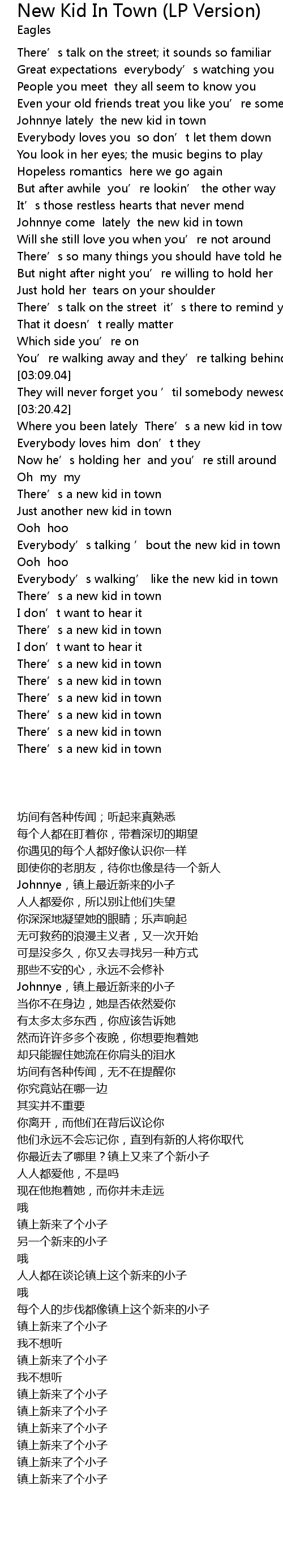 | [03:23.03] | Where you been lately There' s a new kid in town |