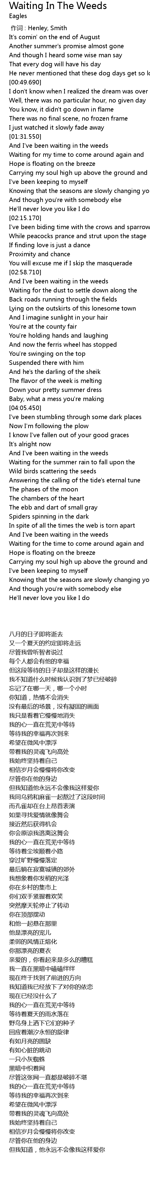 | [01:34.840] | And I' ve been waiting in the weeds |