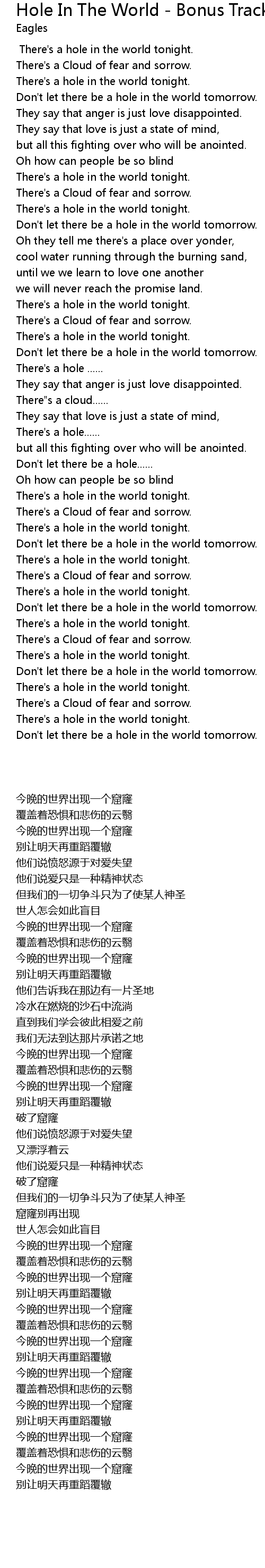 | [03:21.700] | There' s a hole in the world tonight. |