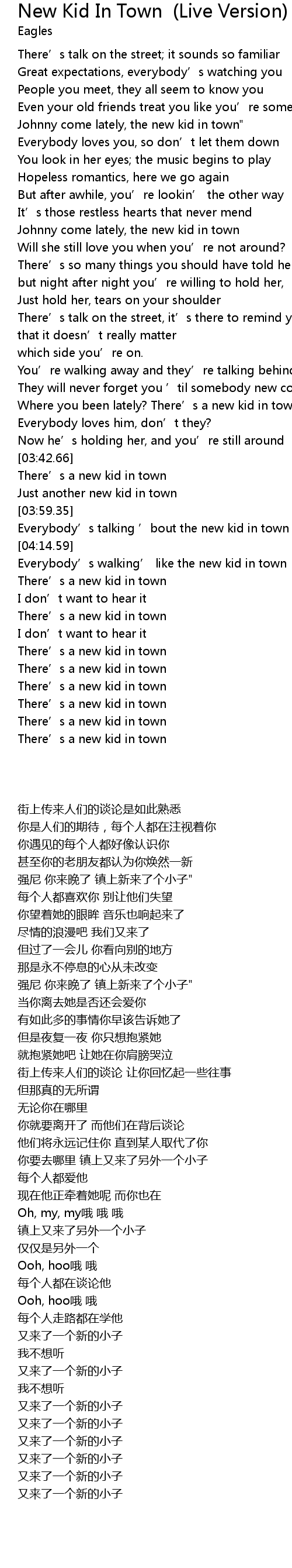 | [03:21.95] | Where you been lately? There' s a new kid in town |