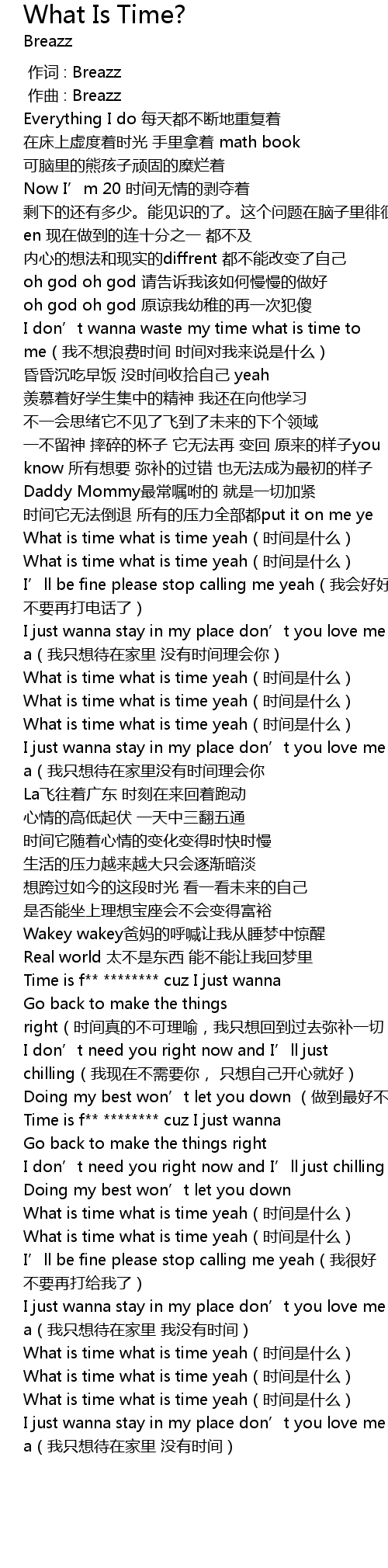 | [01:34.550] | What is time what is time yeah shí jiān shì shén me |