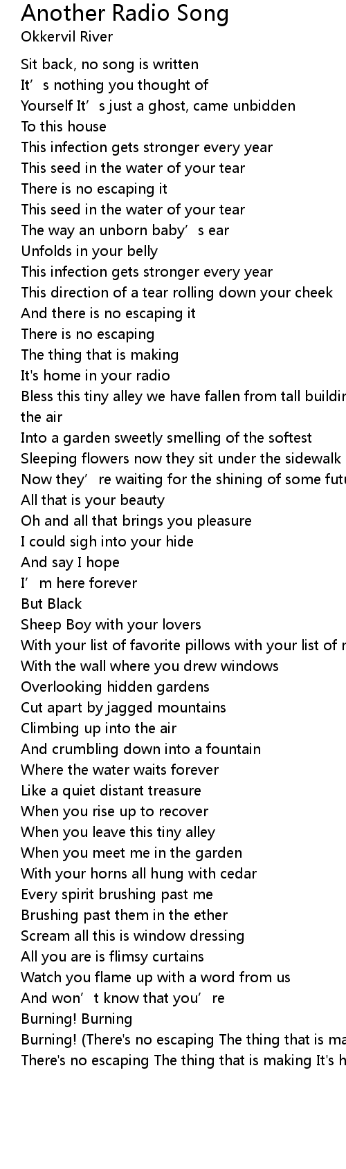 | Burning! There' s no escaping The thing that is making It' s home in your radio There' s no escaping The thing that is making It' s home in your radio |