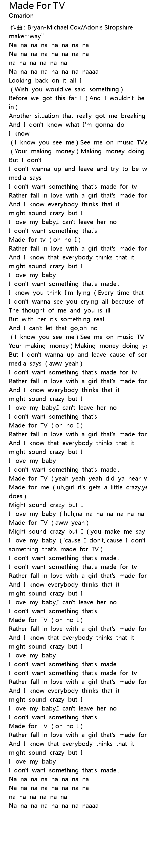 | [02:41.60] | Made for TV (yeah yeah yeah did ya hear what I said) |