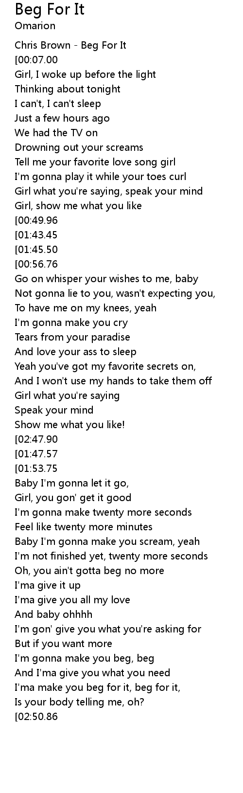 | [02:56.35][02:47.90][01:49.41][01:40.41] | I'ma make you beg for it, |