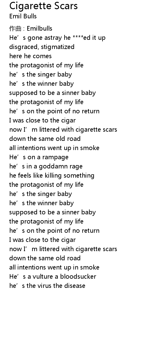 | now I' m littered with cigarette scars | |