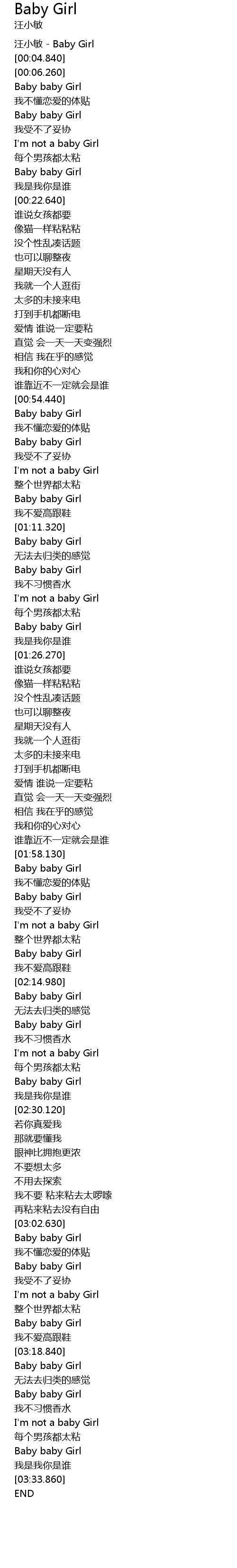 | [00:04.220] | 汪小敏 - Baby Girl |